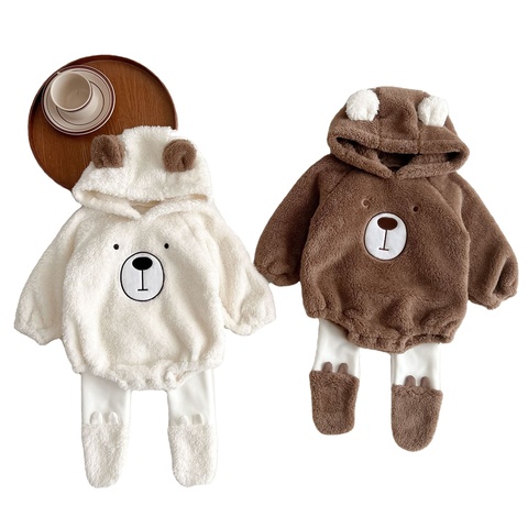 ベビー服秋冬かわいいフード付きクマベビーぬいぐるみロンパースクロール服暖かい両面ベビー服セット男の子