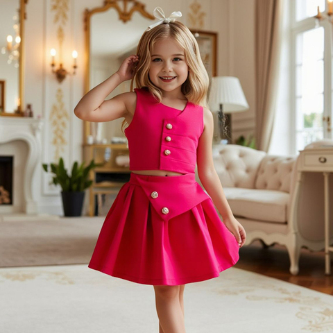Zomer Hete Verkoop Meisjes Kleding Sets Effen Kleur Knoop Decor Vest + Rok 2 Stuks Kinderen Mouwloze Pak