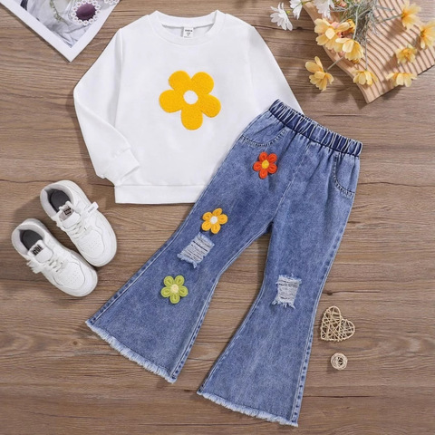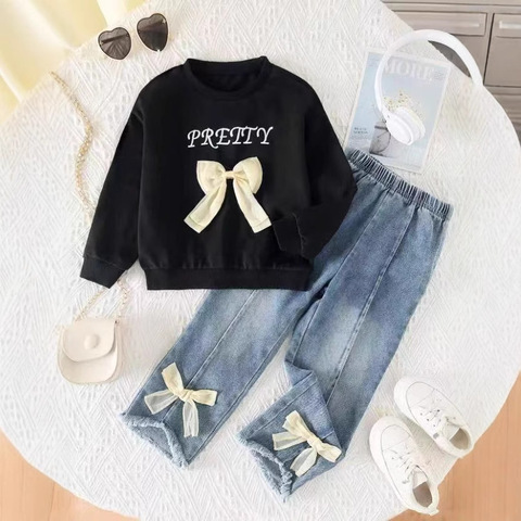 Kant En Klaar Verzending Voor Kinderen Kleding Met Lange Mouwen En Lange Mouwen, Jeans Met Ronde Hals, Kinderkleding Herfst Meisjes Peuter Twee Stuks Set