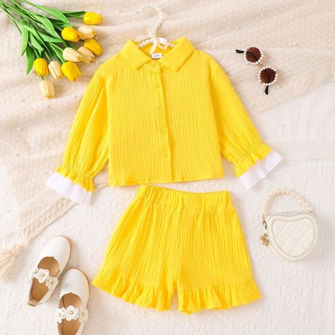 2025 Nieuwe Herfst Meisjes Kleding Sets Voor Casual Kinderen Speelse Stijl Effen Kleur Shirt Met Ruches Short Tweedelige Set