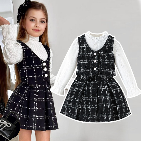 فستان أميرة للفتيات، فستان بولو سادة مع صدرية مزينة باللؤلؤ، طقم ملابس من قطعتين للفتيات الصغيرات بأسلوب غربي أنيق