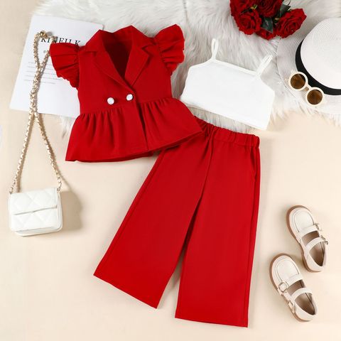 طقم صيفي جديد للأطفال مكون من ثلاث قطع: بلوزة عصرية بياقة وأكمام مكشكشة، وجاكيت، وبنطلون بدون حمالات