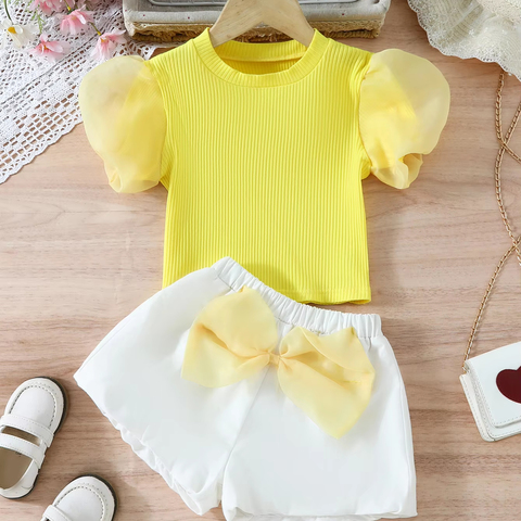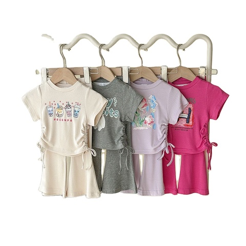 लड़कियों के लिए फैशनेबल बच्चों के ग्रीष्मकालीन कपड़े दो टुकड़े सेट छोटी आस्तीन टी-शर्ट और छोटी पैंट वाली छोटी लड़कियों के कपड़े