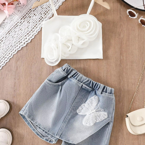 2025 गर्मियों की गर्म शैली के लिए लड़कियों के कपड़े सेट नए बच्चों 3 डी फूल निलंबित टी-शर्ट तितली डेनिम शॉर्ट्स सेट
